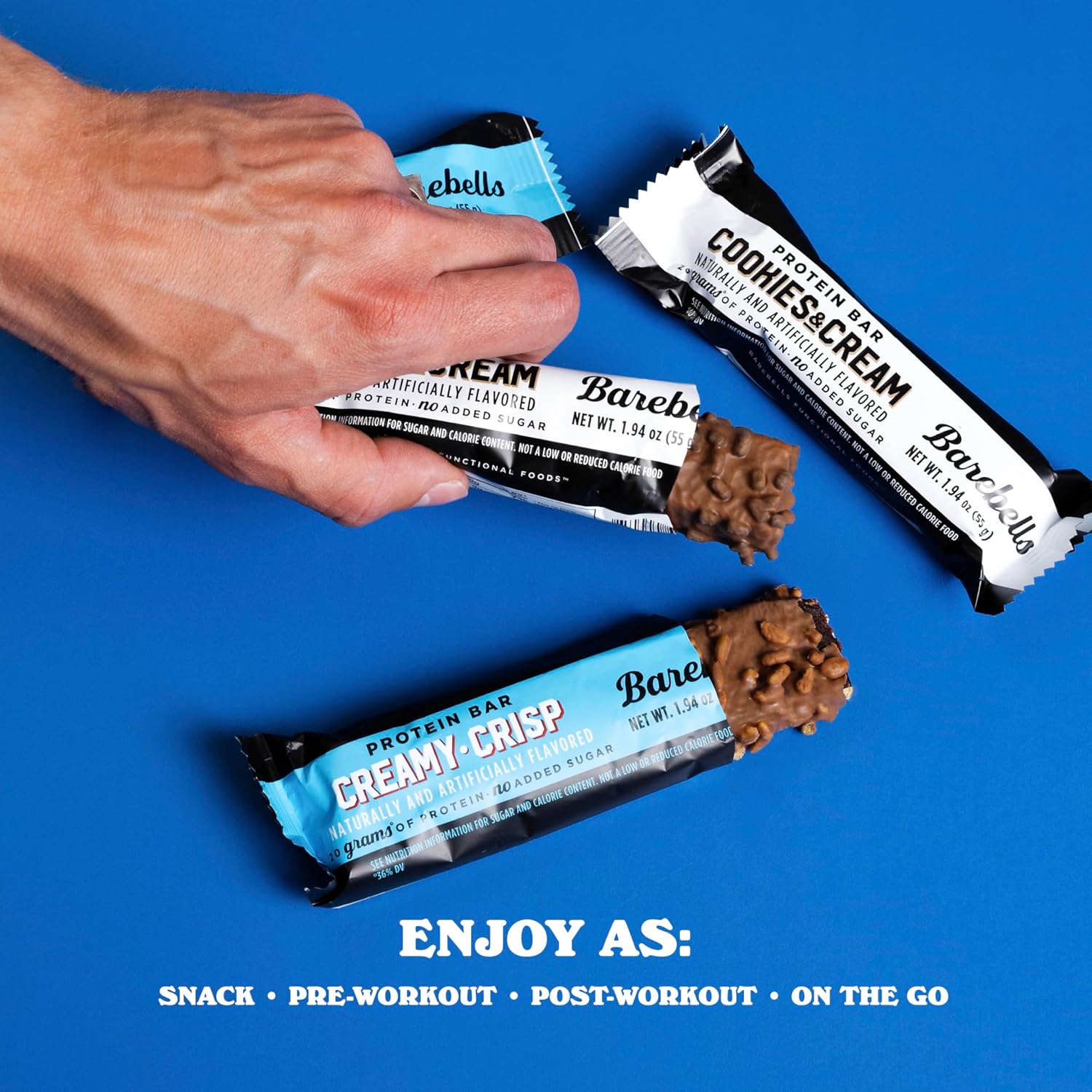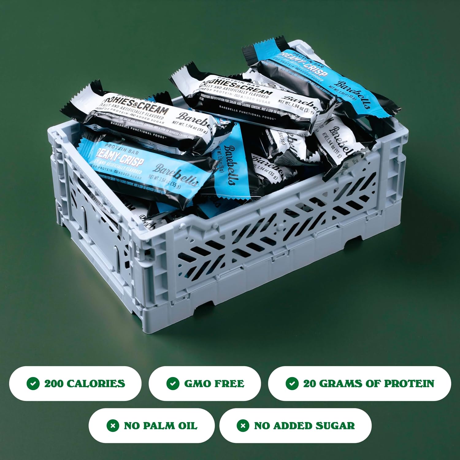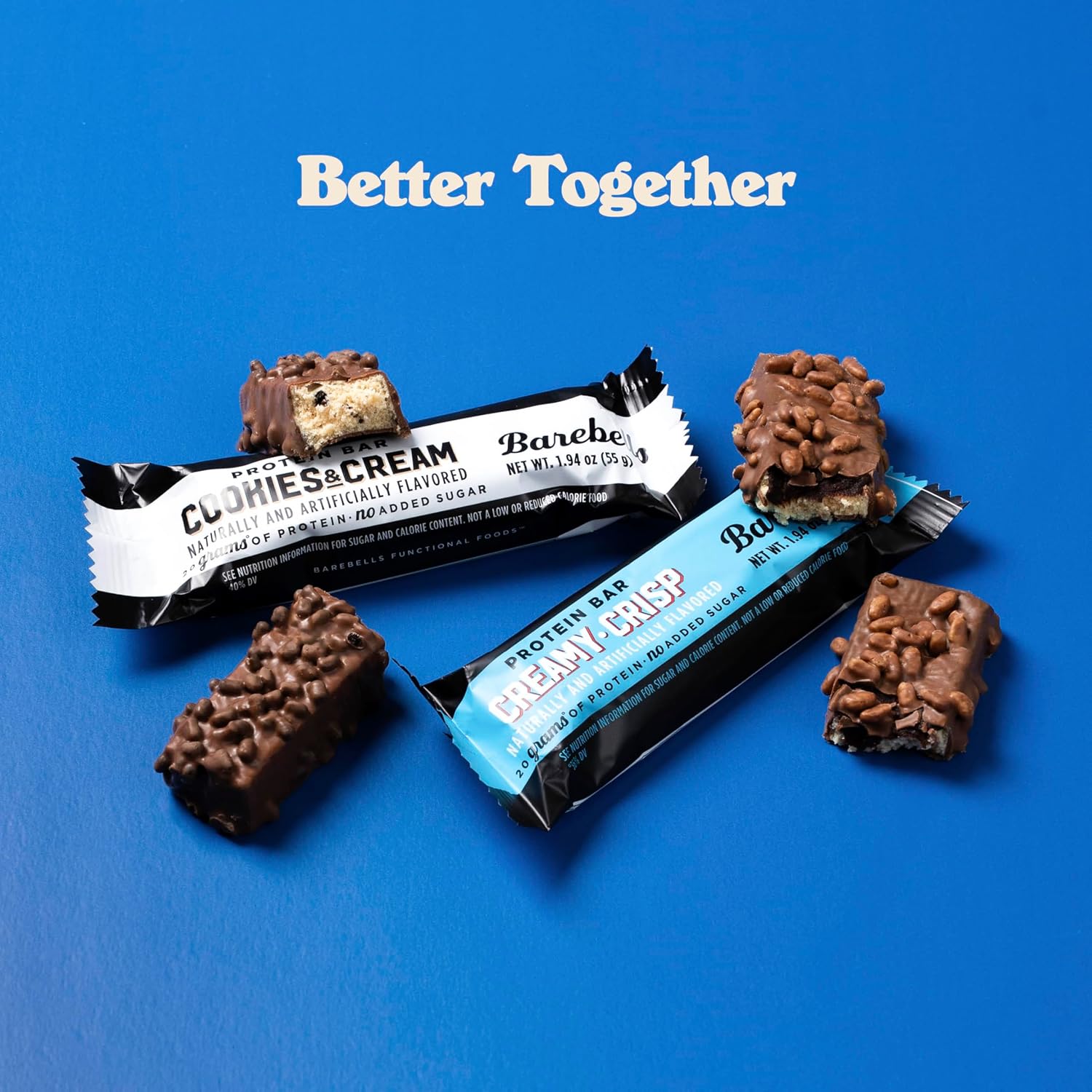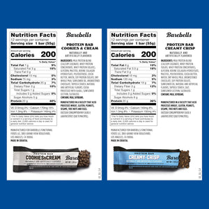 - BAREBELLS COMBO PACK (2 PACKS OF 12) – What’s better than your two favorites in one box? This combo includes 12 Creamy Crisp and 12 Cookies and Cream protein bars—your ultimate flavor duo. Whether you’re craving the fudge and cream flavors Creamy Crisp or the classic cookie-inspired taste of Cookies and Cream, this pack delivers. With 20 grams of protein and no added sugar*, it’s a crave-worthy way to fuel your day without compromise.