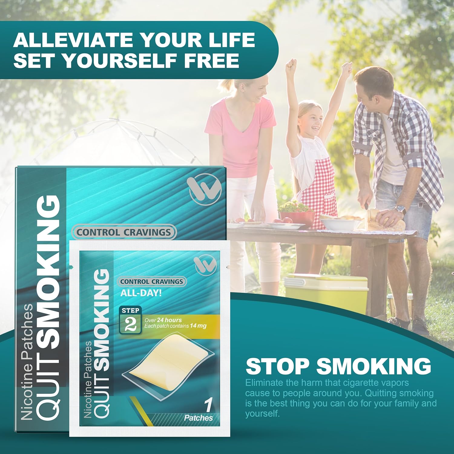 - NICOTINE PATCHES STEP 2: Smoke no more than 10 cigarettes a day and use the 14mg Nicotine Patch as a smoking cessation aid. Each patch releases 14mg of nicotine over 24 hours to help you overcome your addiction. (Read the Behavior Support Plan Self-Help Guide before using.)
